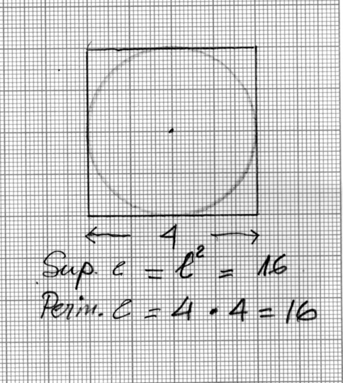 En un cuadrado cuyo lado es de igual medida que el diámetro de la circunferencia en cuestión también reune el requisito de que su perímetro en metros lineales arroja la misma cifra que su superficie en metros lineales.